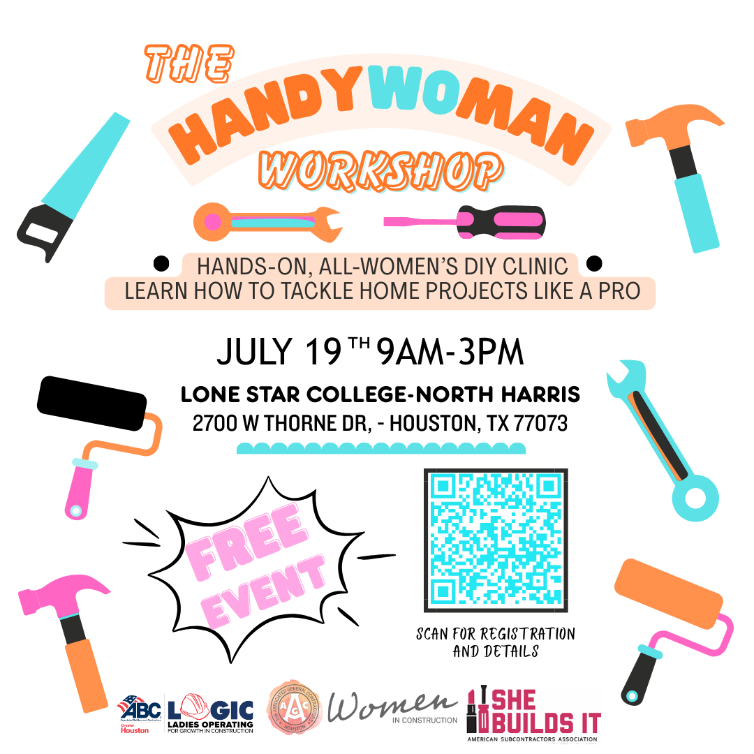 Join AGC Houston's Women in Construction Committee, ABC of Greater Houston's LOGIC Committee, and the American Subcontractors Association-Houston Chapter's She Builds It Peer Group for a FREE Women's DIY Workshop on July 19th! This hands-on all-women DIY event is where you'll gain real skills, boost your confidence, and learn how to tackle home projects like a pro.