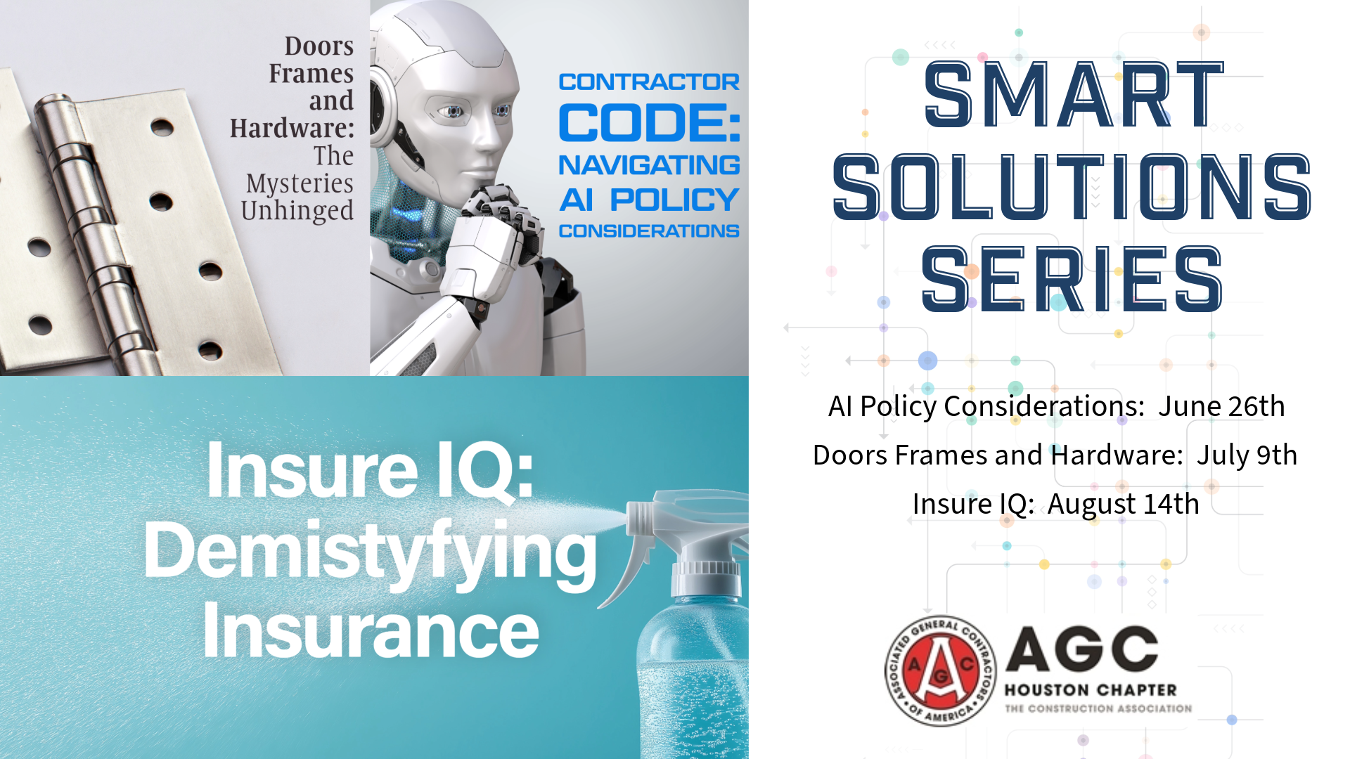 AGC Houston is excited to launch our new Smart Solutions Series this summer! This series of FREE, in-person educational programs is designed to provide timely, practical knowledge on topics that matter most to our members. Join us as we explore critical issues like AI policy in construction, insurance best practices, and door, frames, and hardware essentials. Don't miss this opportunity to learn and apply smart solutions to your daily operations!