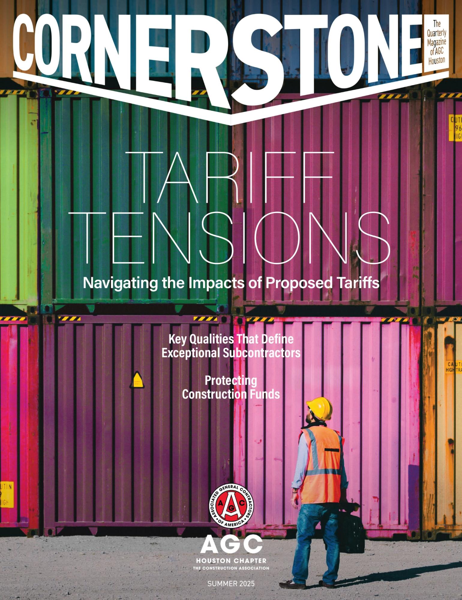 We're excited to announce that the Summer 2025 Cornerstone Magazine is now published and available online! This issue features an in-depth look at Satterfield & Pontikes Construction, Inc.’s award-winning Fort Bend County Epicenter project, strategies for navigating proposed tariffs, guidance on how to protect construction funds from Peckar & Abramson, P.C., qualities that make an exceptional subcontractor, safety best practices from AGC of America’s Construction Safety Excellence Awards (CSEA) winners, and much more.