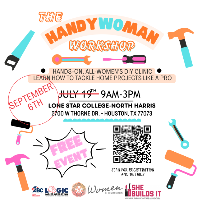 Hosted by the AGC Women in Construction Committee in partnership with the ASA She Builds It Peer Group & ABC LOGIC Committee, this hands-on, all-women DIY event is where you’ll gain real skills, boost your confidence, and learn how to tackle home projects like a pro. Whether you’ve never held a power tool or want to sharpen your skills, you’ll get hands-on training in a fun, supportive environment. Learn how to patch drywall, wire light fixtures, install plumbing, mount heavy items, and more!