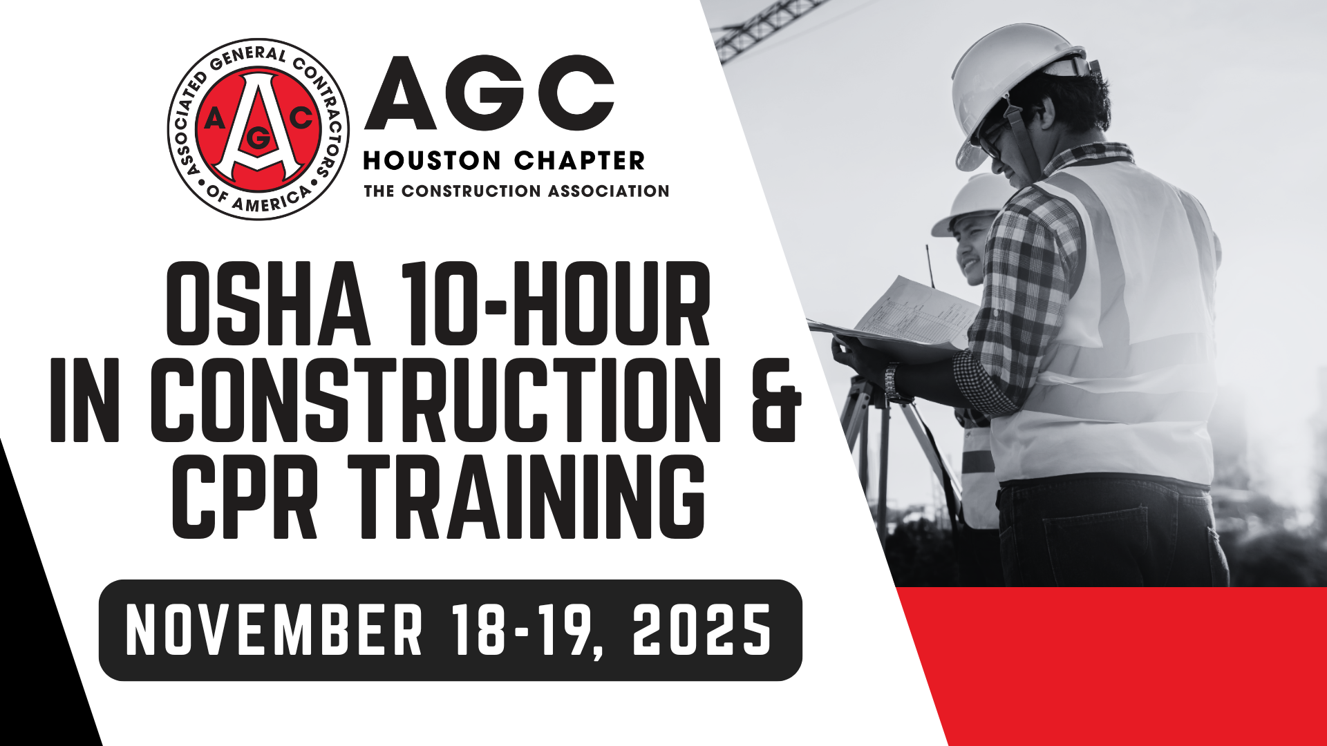 Time is running out to register for AGC Houston’s OSHA 10-Hour in Construction & CPR Combo Training! Presented by AGC Houston’s authorized instructors, it is designed to train employees in the basic essentials of occupational safety and health in construction. Day two of this class will include an optional CPR training session for participants who wish to get CPR training.