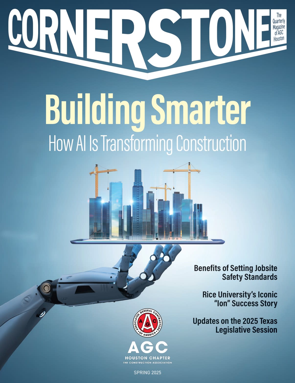 We're excited to announce our new partnership with m3 Magazines! AGC Houston's Cornerstone Magazine has a brand-new look and feel, designed with our members in mind. This issue features an in-depth look at Gilbane Building Company's iconic Rice University Ion project, a detailed update on the 2025 Texas legislative session, explores the critical benefits of implementing strong jobsite safety standards, and much more.