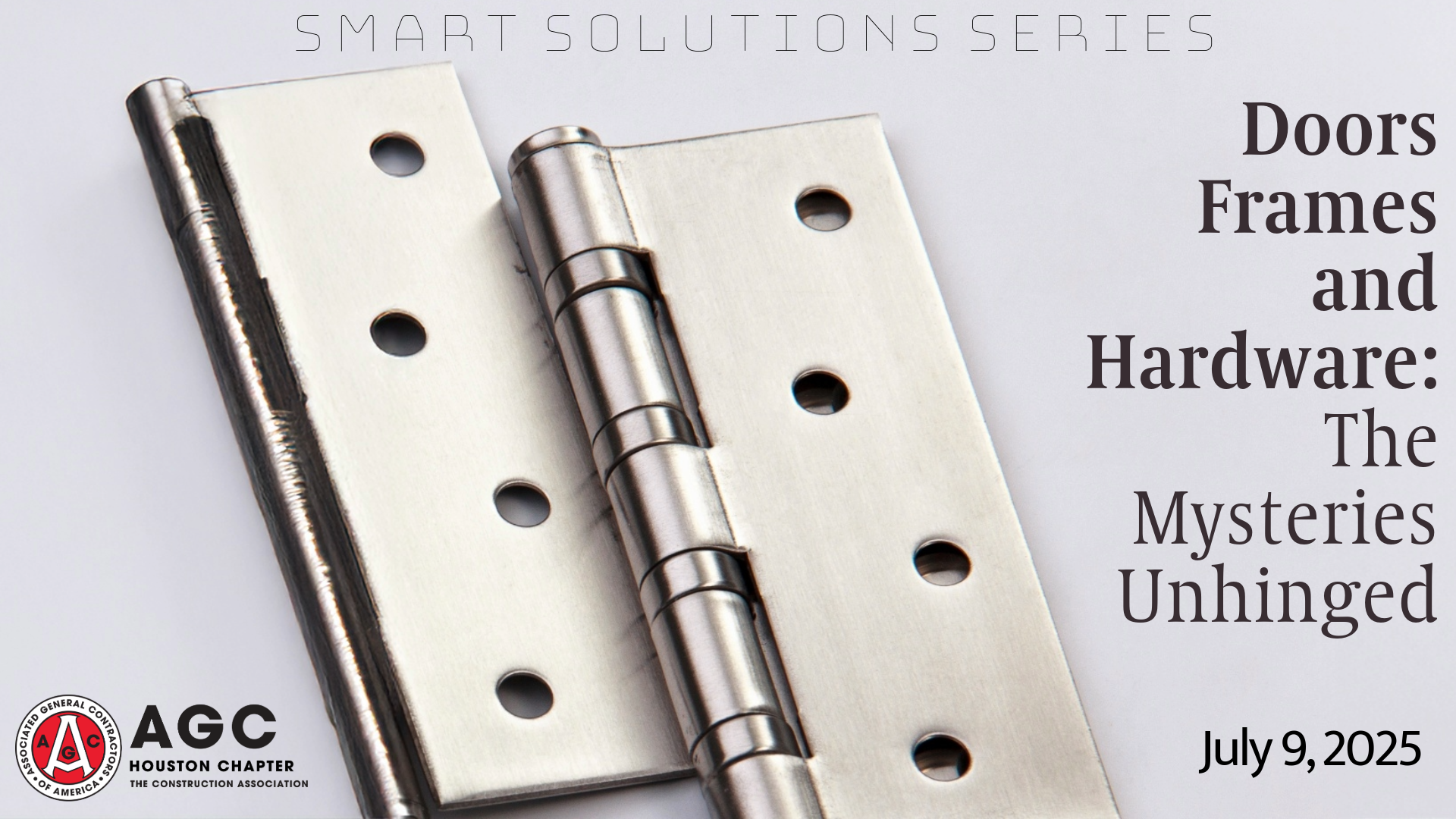 AGC Houston is excited to launch our new Smart Solutions Series this summer! This series of FREE, in-person educational programs is designed to provide timely, practical knowledge on topics that matter most to our members. Join us as we explore critical issues like AI policy in construction, insurance best practices, and door, frames, and hardware essentials. Don't miss this opportunity to learn and apply smart solutions to your daily operations!