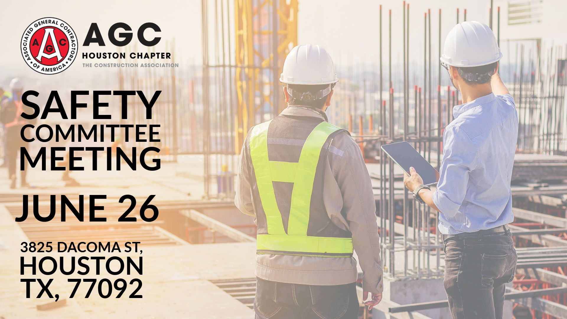 Join us here at AGC Houston for our Safety Committee meeting on THURSDAY, June 26, 2025, from 6:30-8:30 am. We'll discuss OSHA updates, legal matters, weed, weather, workplace violence, and you! This is definitely a meeting you don't want to miss! Doors open at 6:00 am. Come early to grab a seat and enjoy our famous hot breakfast sponsored by Lee Hart with Safety By Design, Inc.