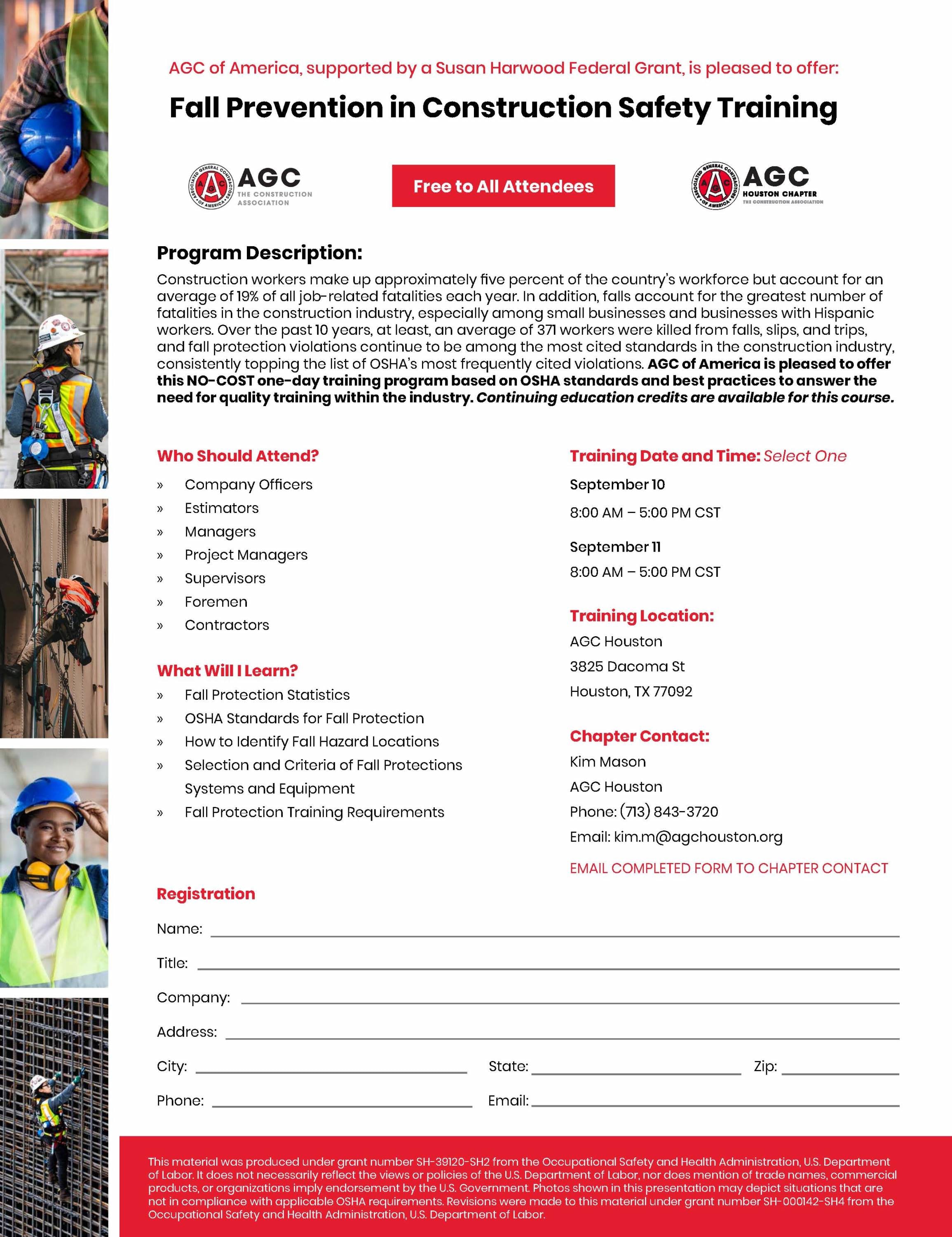 Construction workers make up approximately five percent of the country's workforce but account for an average of 19% of all job related fatalities each year. In addition, falls account for the greatest number of fatalities in the construction industry, especially among small businesses and businesses with Hispanic workers. Over the past 10 years, at least an average of 371 workers were killed from falls, slips, and trips, and fall protection violations continue to be among the most cited standards in the construction industry, consistently topping the list of OSHA's most frequently cited violations. AGC of America is pleased to offer this NO-COST one-day training program based on OSHA standards and best practices to answer the need for quality training within the industry.