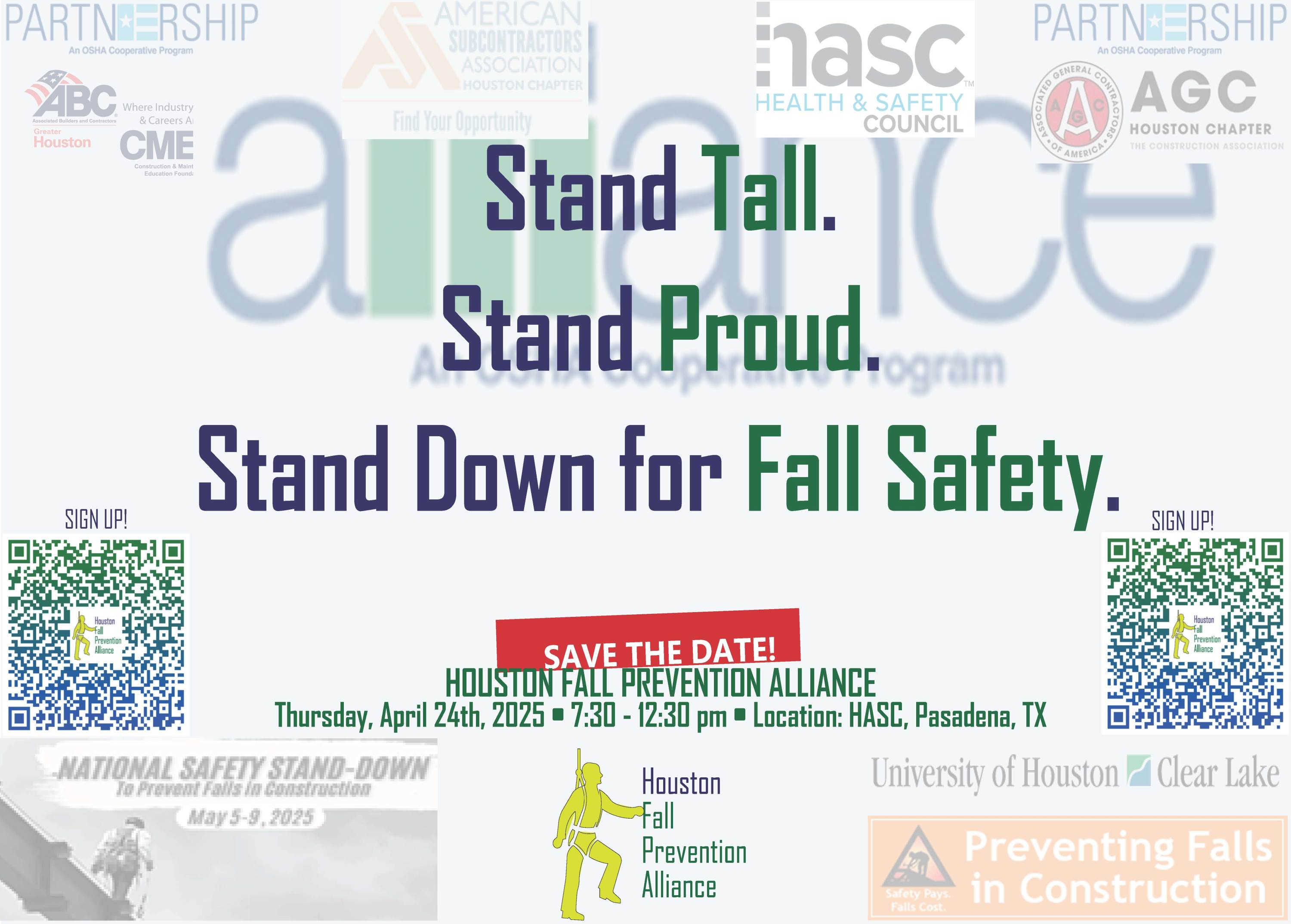 Join us at the annual Fall Prevention Alliance and 2025 Stand Down Kickoff event at Houston Area Safety Council in Deer Park Thursday, April 24, 2025. Come out and get safety information and updates, meet vendors for your stand down events, watch product demos, and network with your peers. This event will take the place of our April safety meeting. REGISTER USING THE QR CODES ON THE ATTACHED FLYER.
